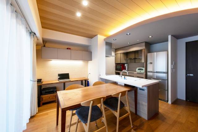 お持ちの家具にテイストを合わせるべく設備や内装共にリフォーム工事をご依頼頂きました。キッチン上部はアール形状の下がり天井に改修し、そこへコーブ照明を仕込みました。
