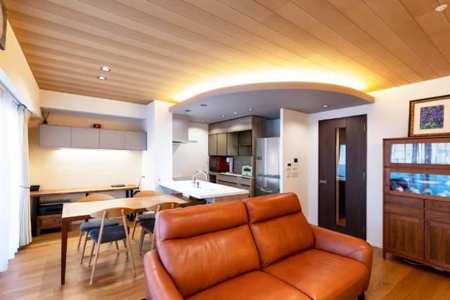 住まいの中で、人が集まりくつろぐ場を、下がり天井によってゾーンを分けることで、家具配置や照明演出がしやすくなります。