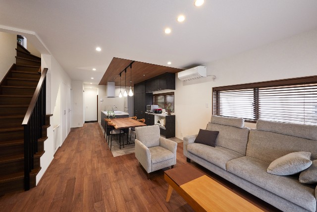◼️銘木の飾り棚や木製の室内窓で個性が光るリビング空間