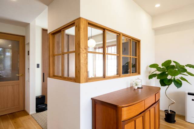 和室を一部リビングに取り込み、LDKを開放的な空間に改修しました。銘木の飾り棚や家具と馴染むよう塗装した特製の室内窓など、個性が随所に光るリビング空間となりました。