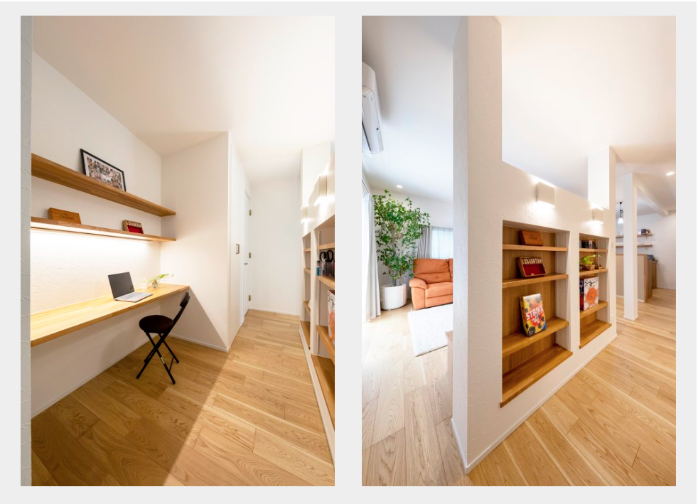 全面リフォームしました。お子様の将来を見据え夫婦の仕事スペースだけでなく、勉強スペースとしてデスクカウンターと収納棚を造作しました。半独立型なので、勉強や仕事に集中して取り組める空間になっています。