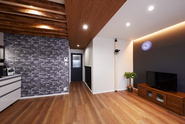 家の間取りを反転させ、リビングを家の北側から南側へ間取り変更しました。明るくなったリビングには造作梁やアクセントクロスを取り入れ、こだわりの空間に仕上げました。