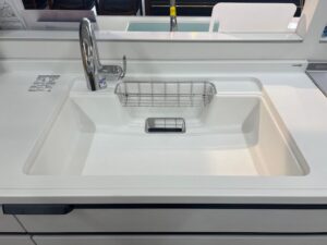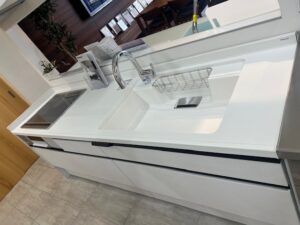扉柄はアースホワイト、天板は人造大理石を選定しています。