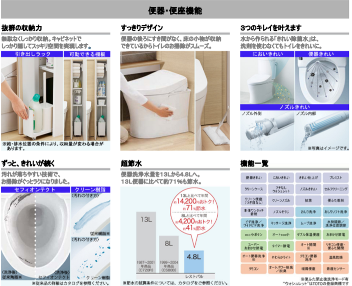 ③清掃性→便器の背面に余分な隙間がないのでお掃除しやすく、鉢内もTOTO独自の「きれい除菌水」によってキレイが長持ちします。