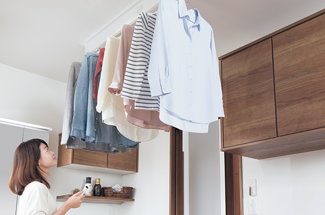 普段は天井内にしまっておくことが出来、使うときだけ竿をおろし室内干しが可能になります。