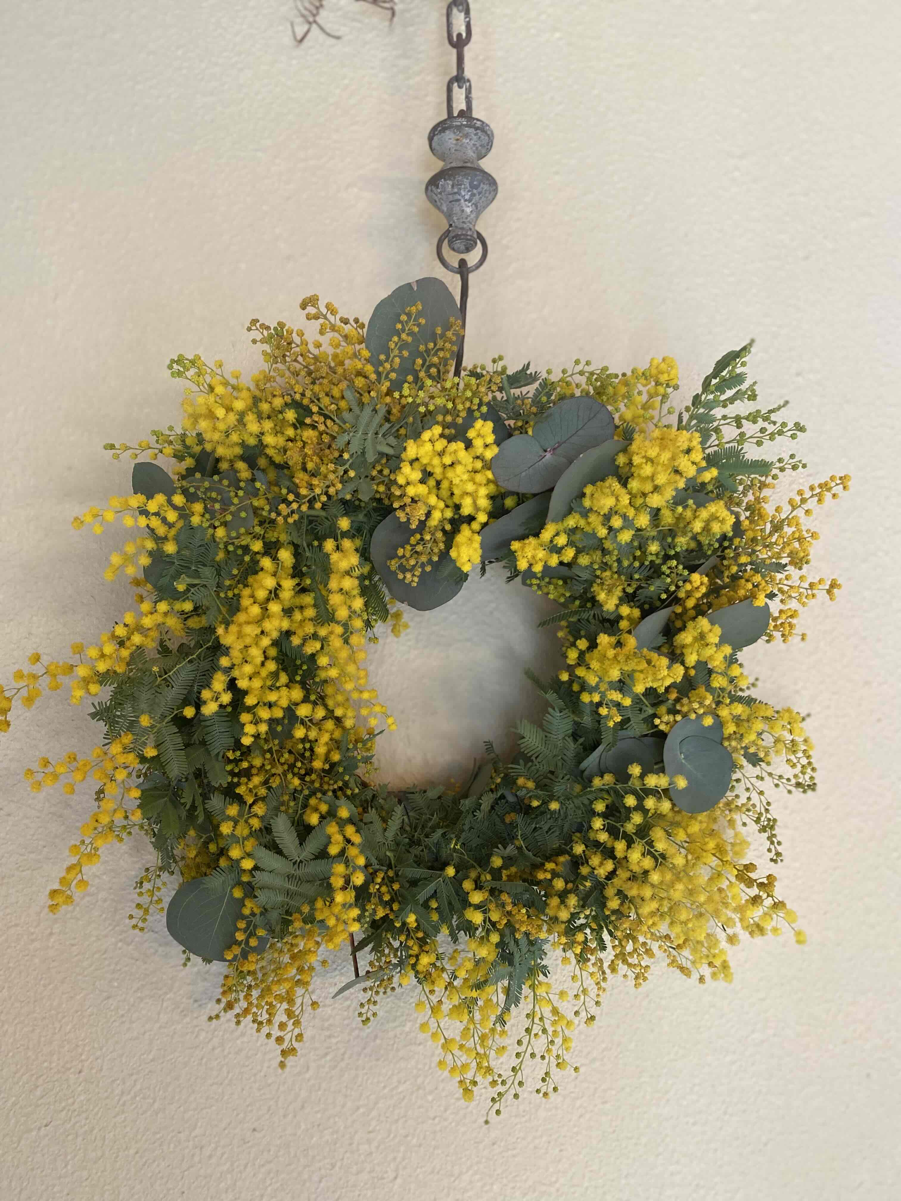 ユーカリとミモザを合わせたリースの完成です。