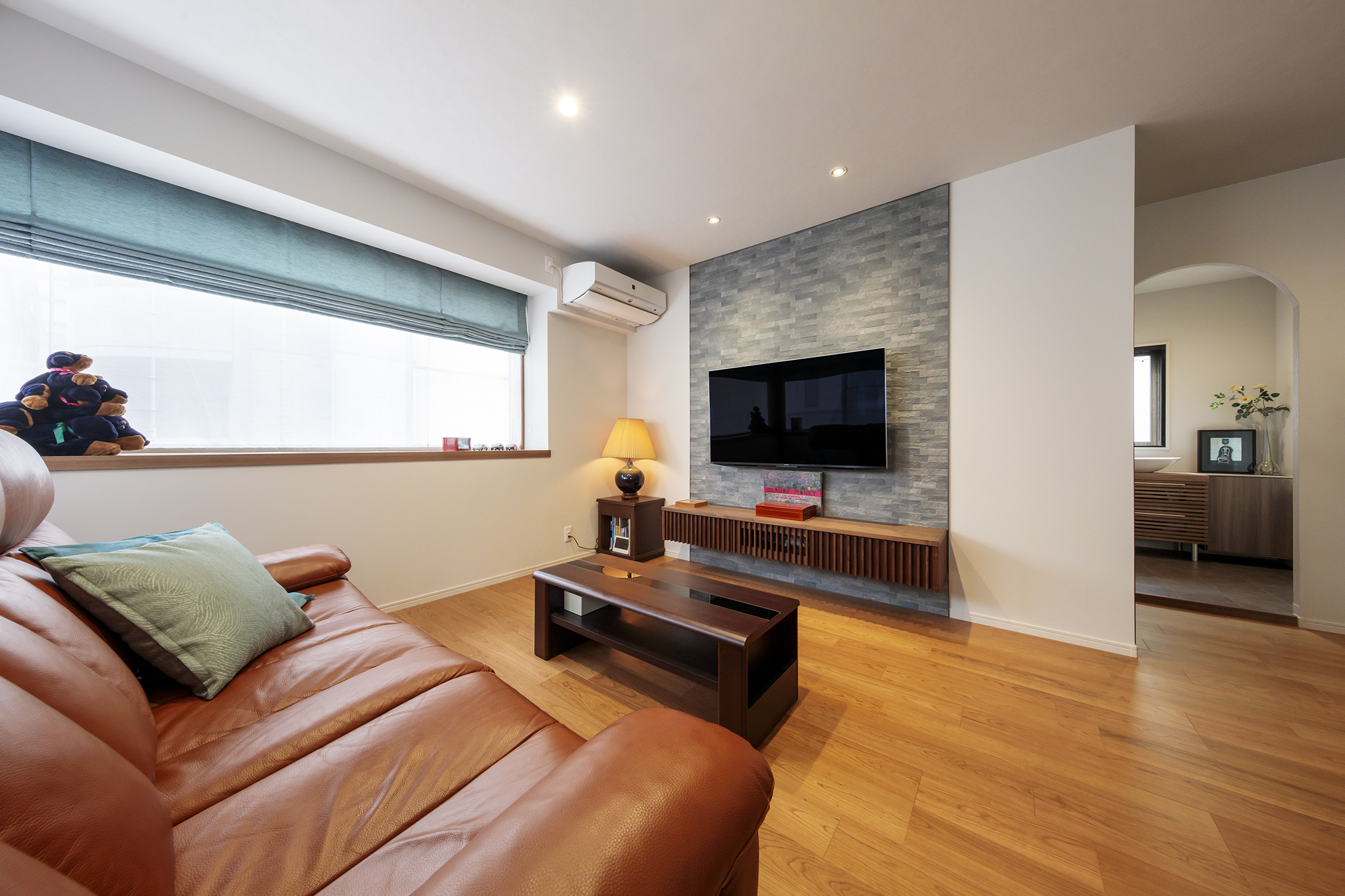 またTVの部分は収納をフロート施工し、壁掛けTVを採用し、背面に