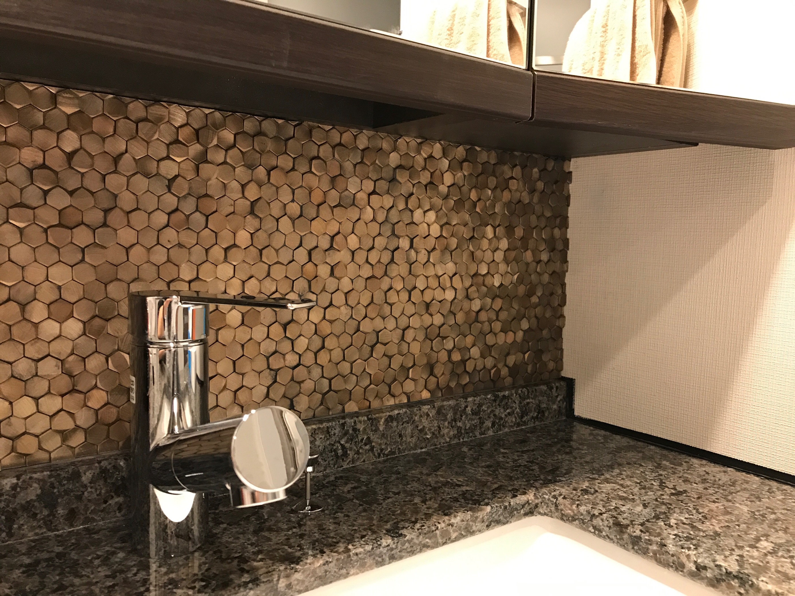 今回は洗面台の天板とミラーの間にアクセントとして貼りました。