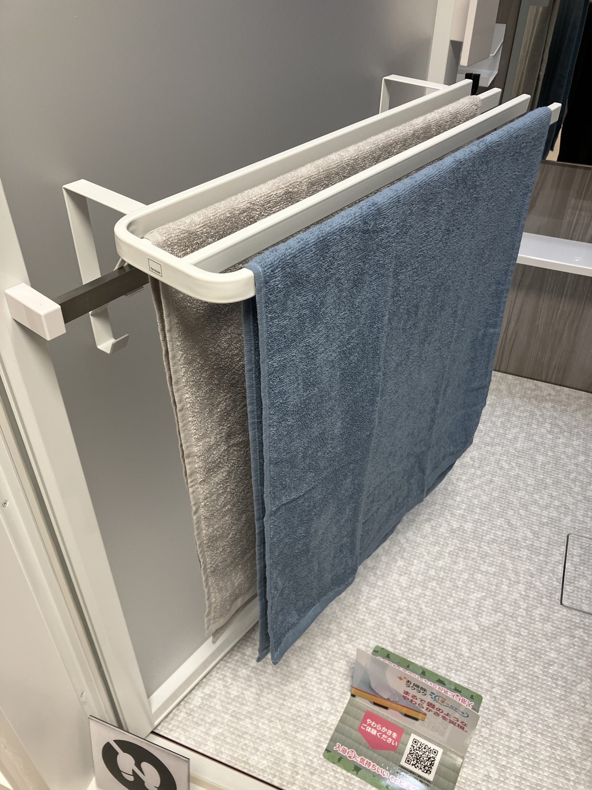 浴室扉のタオル掛けに引掛けて、複数枚掛けられるようにできるバスタオルハンガーです!