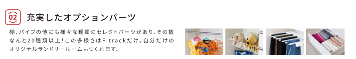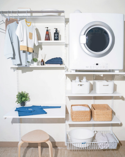 乾太くんを設置する棚以外にもカゴやハンガーパイプなどの収納パーツがあり、棚を増やせば収納のカスタムができます。パーツの種類が豊富です。