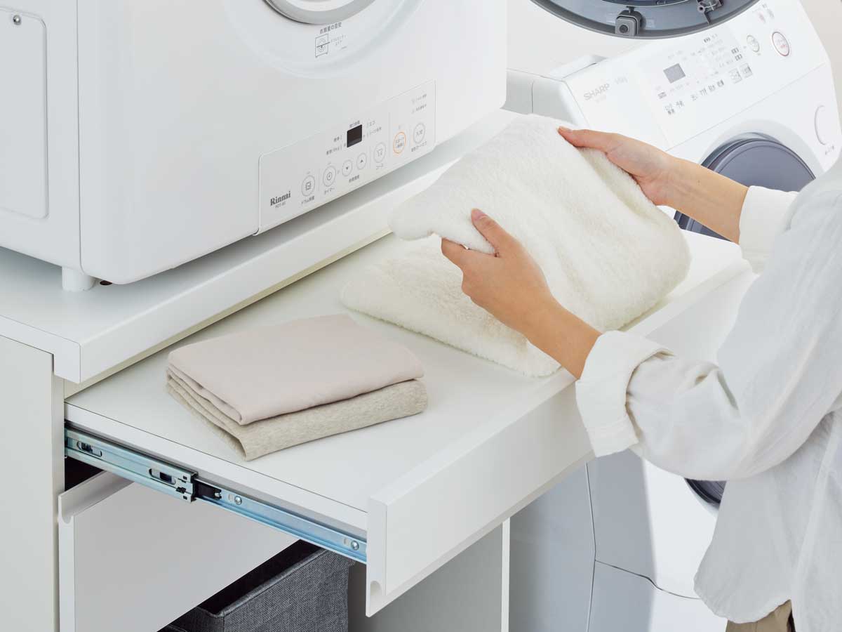「収納ユニット」というだけあり、引き出しがついていて、さらに乾太くんの少し下あたりにスライド式のカウンター、平たく言えば引き出せる台がついていて、出し入れの際、そこに衣類を一時置きできるのが魅力です。