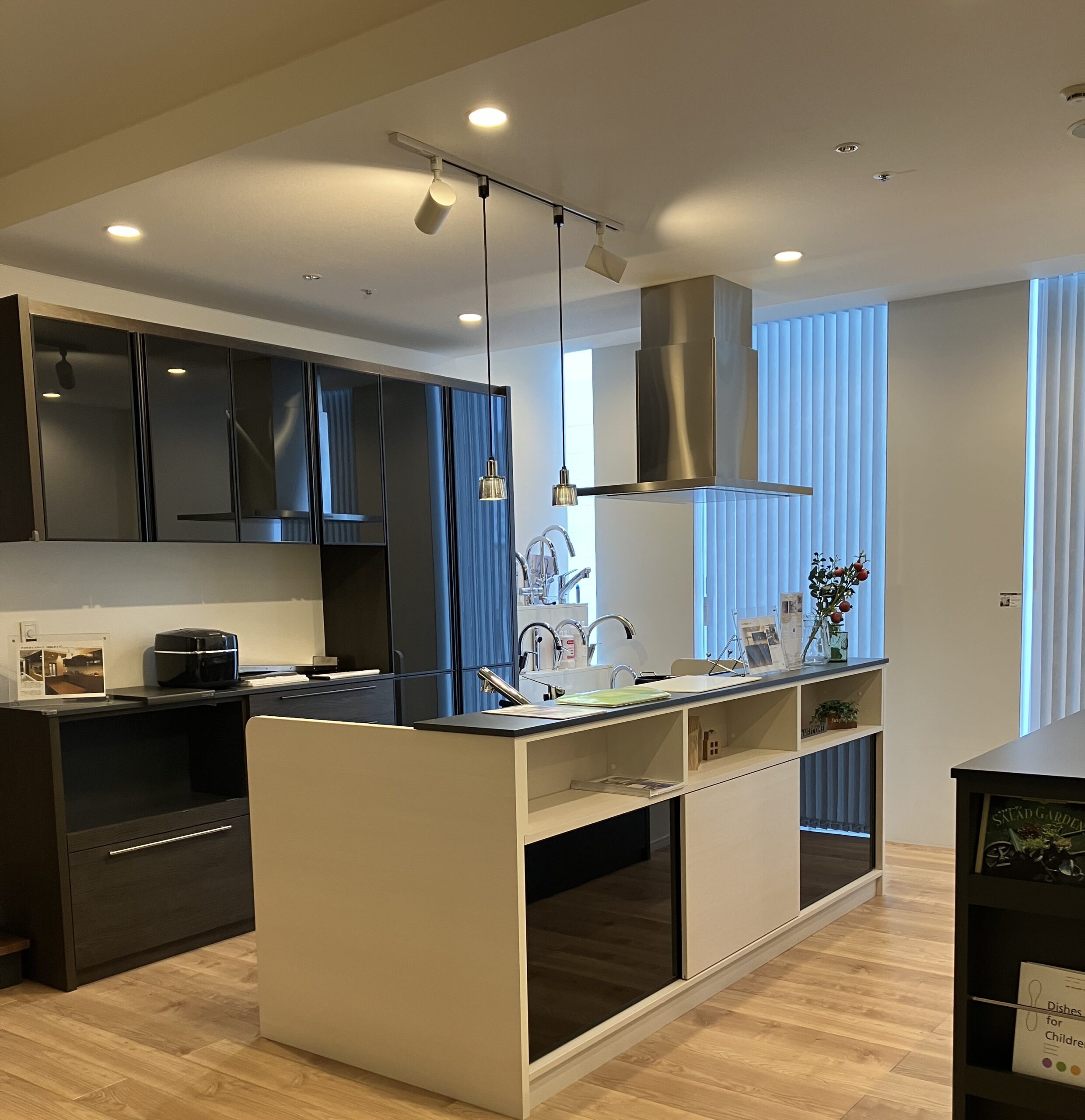 システムキッチンでフラットなイメージも出来ますが、手元は隠したい、収納力を