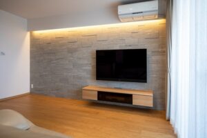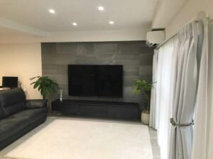 写真のように、テレビ背面の一面にタイルを施工するだけで、空間全体の高級感がぐっと高まります。
