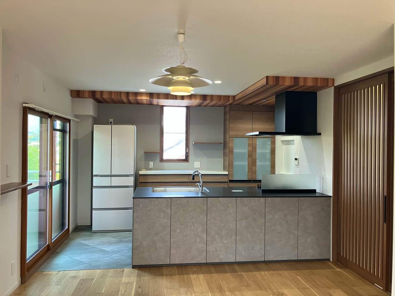換気のダクトを通すために天井を造作する必要があったのですが、その箇所に木目のクロスを貼ることでおしゃれな空間に仕上がりました!
