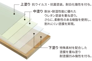 最大7層のウレタン塗装で天然木を水から守る