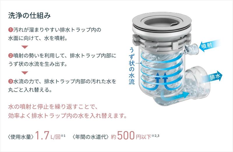 排水トラップ側面に付いた噴射口から水を噴射し、自動でお掃除!