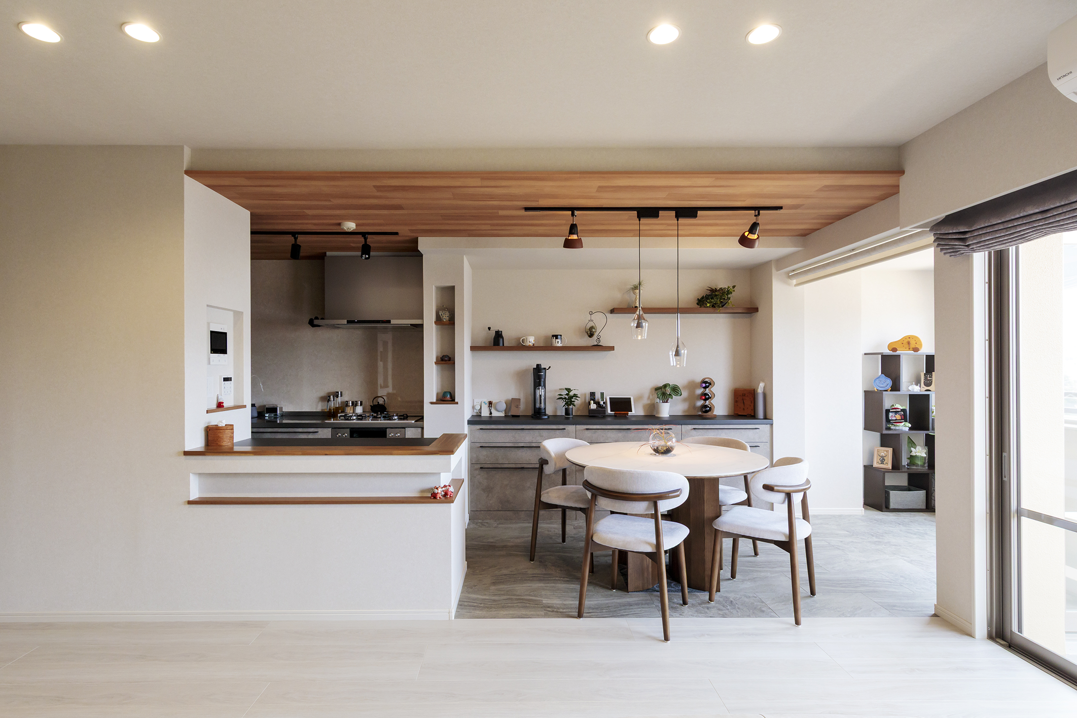 人気のグレー系のお色に天板もブラックでシックで落ち着いた空間に。 通路幅を確保するために、キッチンは元々の位置で壁付けに。 代わりに作業スペース用にカップボードをリビング側に向けて配置しました。
