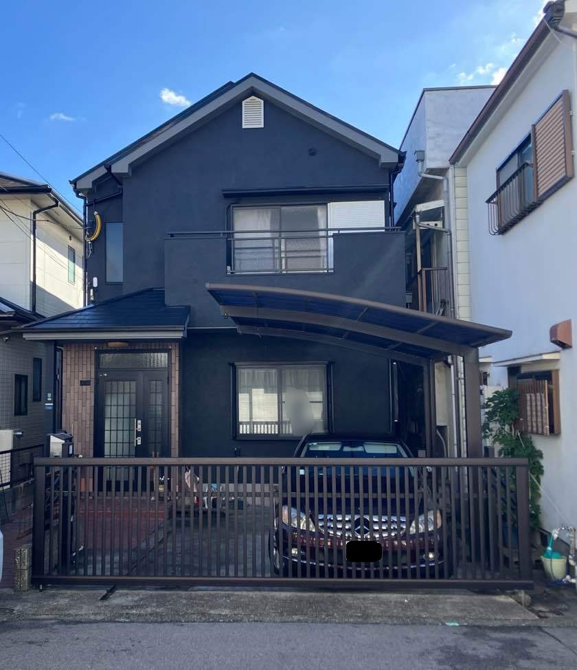 外壁本体を暗めのグレーで塗装し、軒天・破風は少し明るいグレー色で塗り分けすることで、明暗が分かれ美しく仕上がりました。
