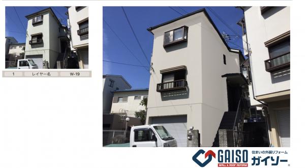下塗りに微弾性フィラーを使用した外壁塗装し、ガイソーウォールハイブリッドSiを上塗りに使用しました。