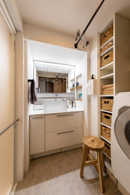 ・トイレ・洗面は既存を活かしつつ明るく刷新、洗面はW1000+ニッチでコストを抑えながら使い勝手を向上