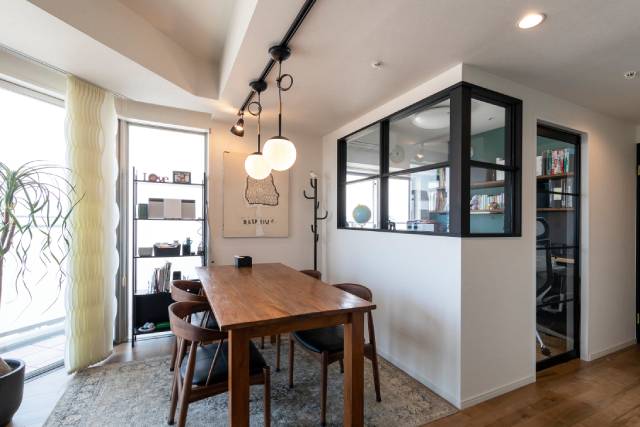 ・造作の室内窓でLDKとつながりを持たせ集中しやすい空間に