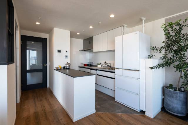 買い物袋をリビングに入ってすぐ置けるほか、料理の配膳もスムーズでデザインも気に入っています。