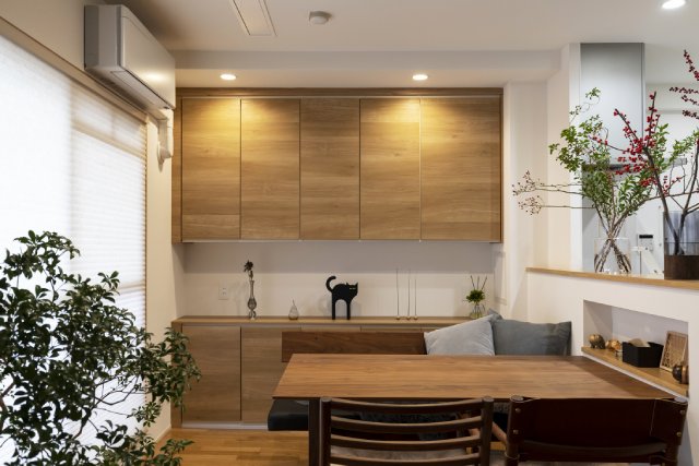 キッチン背面には造作で提案した南海プライウッドのカップボードを設置しました。大容量なので家電製品まですっきりと収納できます。