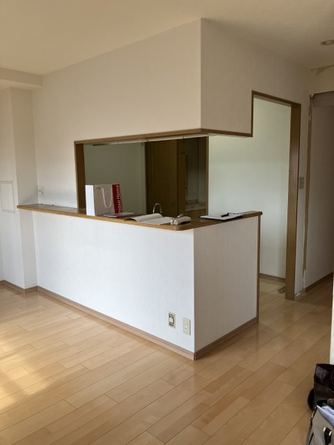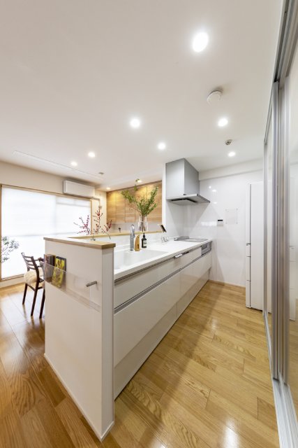 独立型キッチンの壁に圧迫感を感じられていたので周辺の壁を撤去し、開放的な対面キッチンをプランしました。