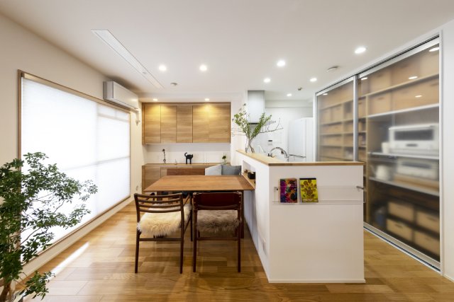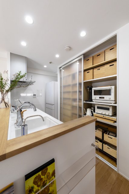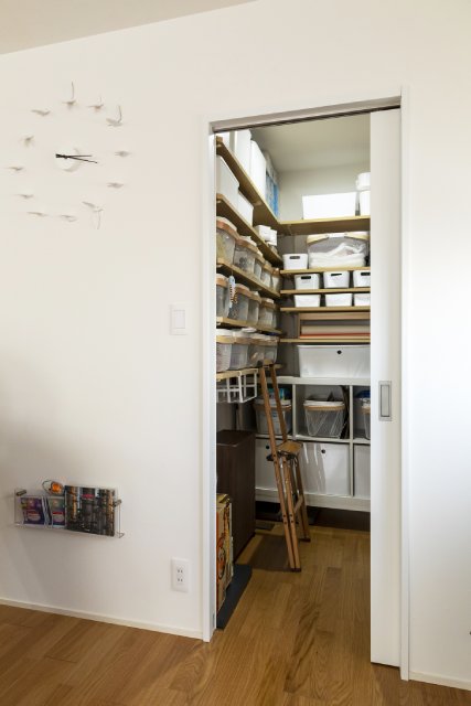 リビングから繋がる納戸はパントリー兼リビング収納としてフレキシブルなスペースとして活用。