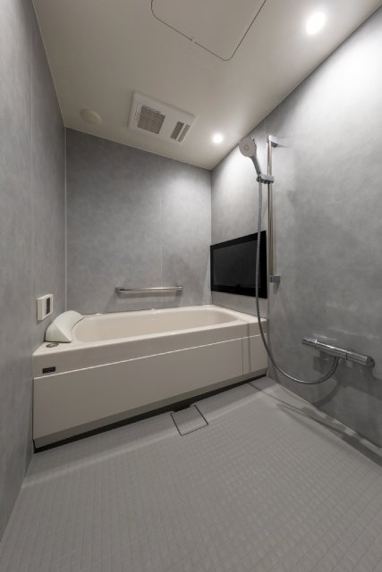 LIXIL スパージュ 壁パネル:シルバーグレー 浴槽:パールホワイト 床:グレー 浴室テレビ:アクアシアター32型/BTV-3201DM |