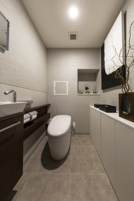 ・将来、自分達も介護が必要になった場合のことも考えトイレ空間を広く確保。カウンタ―収納や埋込ニッチを設けました。