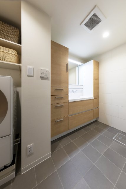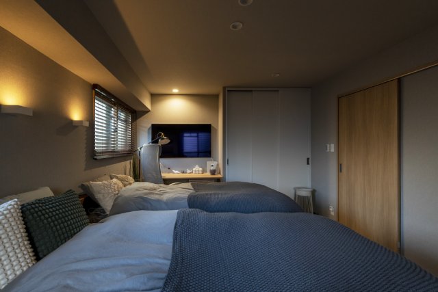 ・プライベートスペースの寝室、浴室、洗面脱衣所、トイレはグレー系の内装でまとめ落ち着いた印象に。