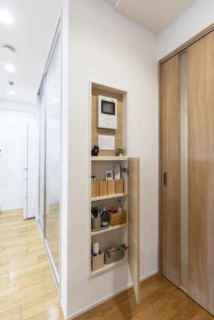 南海プライウッドの【アドキューブ】を採用。インターホンスイッチを埋込にまとめ、ハサミなどの小物をすっきりと収納できます。