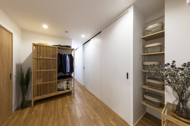 衣装部屋は廊下から洗面脱衣室まで通り抜けができる動線を確保。引き戸の収納棚を提案したことで、限られたスペースや通路幅でもストレスなく開け閉めができます。