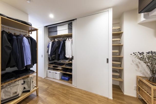 ・衣装部屋としてプランした部屋の壁面には大容量の収納棚を提案。施主様の身長に合わせ、可動棚やハンガーパイプの使いやすい位置を細かく相談しました。