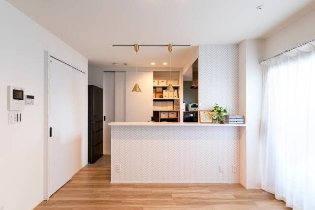 キッチンの腰壁・コンロ壁面には、ヘリンボーン柄クロス【FE-76639】を選定しました。