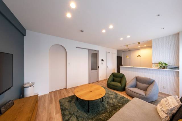 また、テレビ背面とつながる梁にも同じクロスを施工することで空間に一体感を持たせ、デザイン性を高めました。