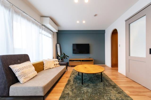 テレビ背面にはサンゲツ【RE-53158】を採用し、空間のアクセントとしました。