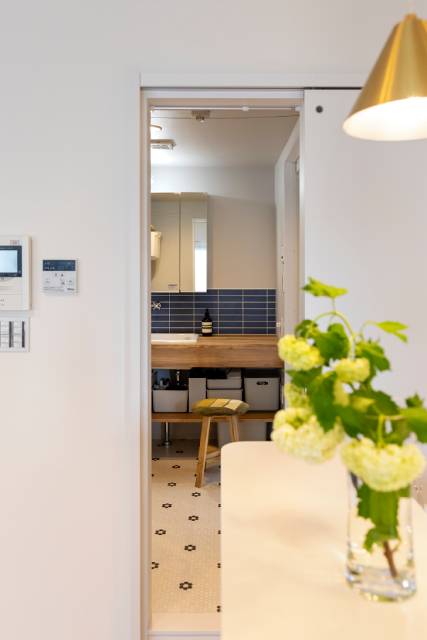・洗面は憧れの造作洗面に、TOTO SK106シンクとレトロな壁出し水栓、アイカのポストフォームカウンターを組み合わせ、理想の洗面台に。