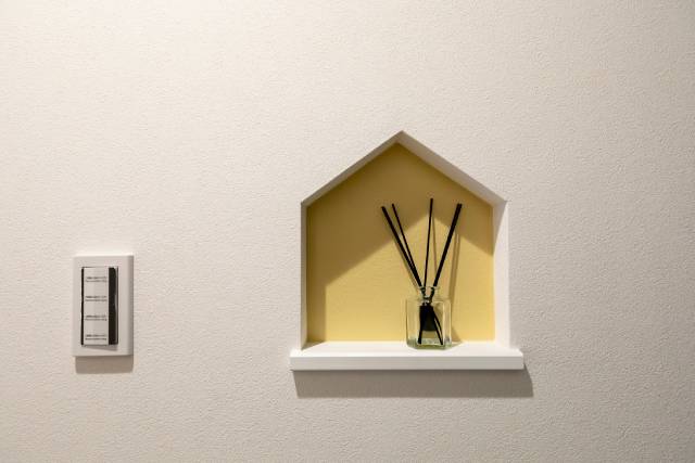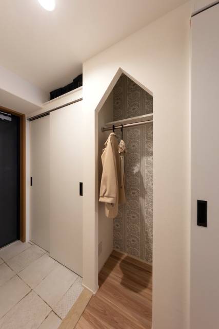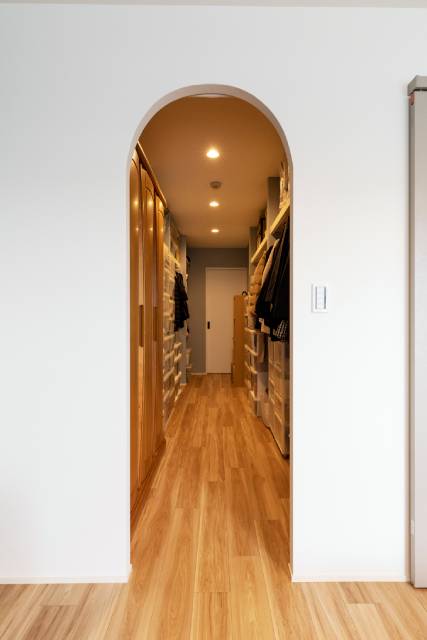 ・WICのアーチ開口、玄関収納横の三角開口、玄関の三角ニッチなど随所に遊び心を演出。
