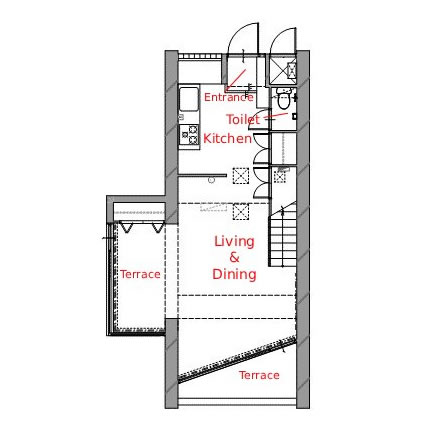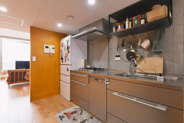・既存のコンクリート壁と木目に調和するようキッチンカラーはシルバーをプラン。