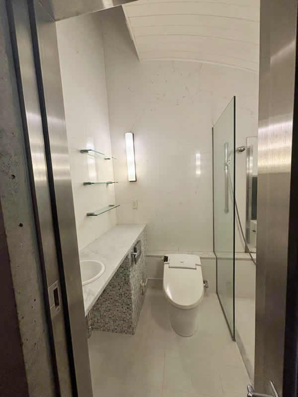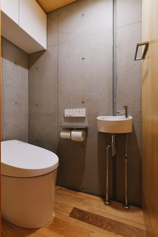 ・トイレは手洗い器を新設し、あえて配管を見せることでコンクリートの質感と調和した無機質で洗練された印象に仕上げた。
