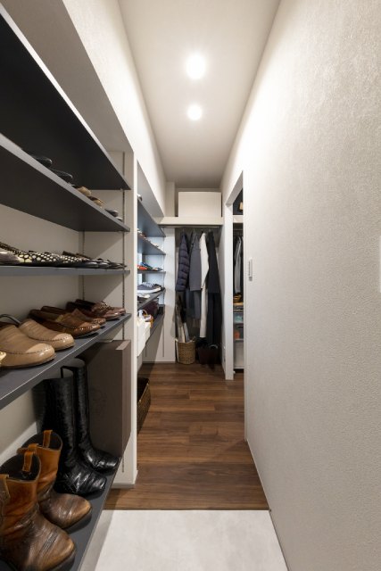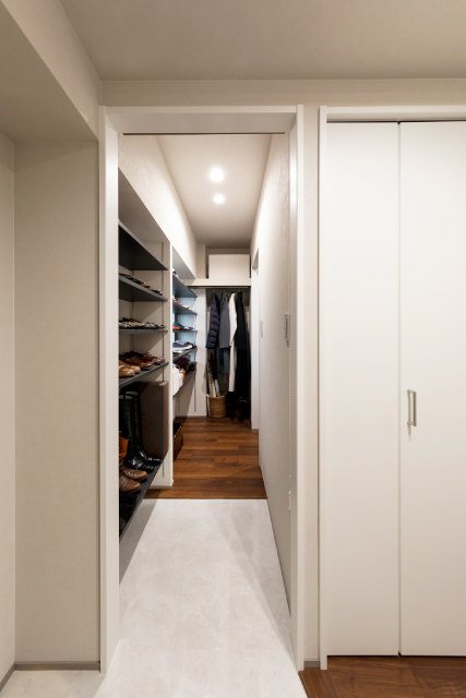 帰宅後に靴を脱ぎ、そのままWICへ行きアウターやアクセサリーを置き寝室へと繋がる無駄のない動線を整えました。