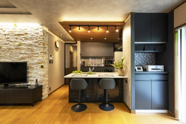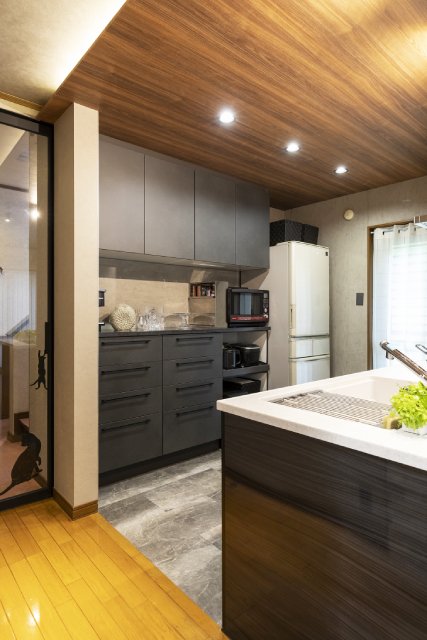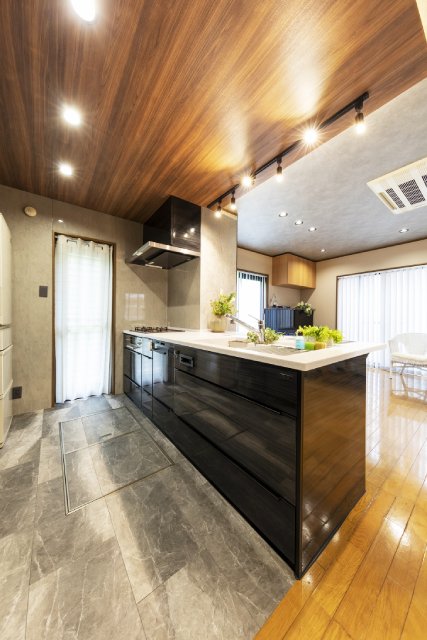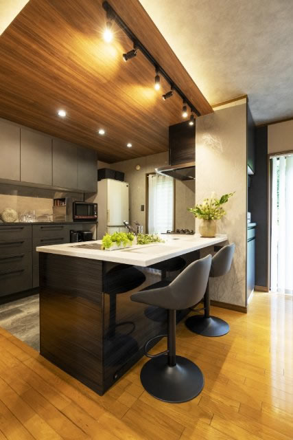 フロアタイルはキッチンと合わせたシックな色で高級感ある空間に。