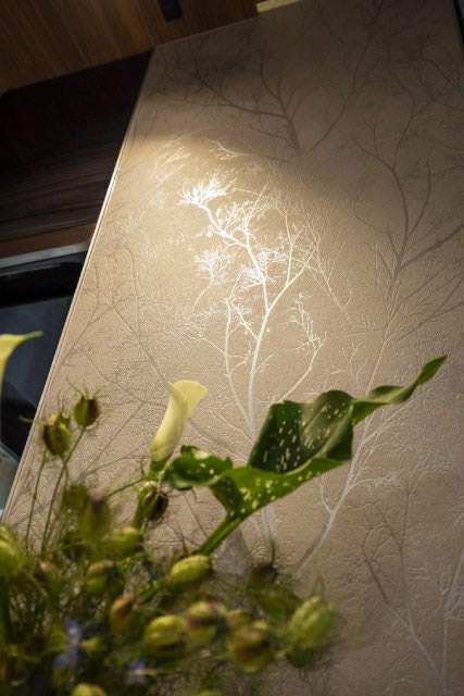 カウンター横には磁石がくっつく壁 『マグロス』を施工させて頂きました。クロスを貼る前に薄いマグネットボードを貼り付けて下地調整をした後、お好みのクロスを上から貼付けます。壁に穴をあける必要がないので自由にレイアウトを楽しめます。