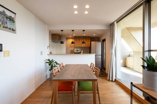 独立していたキッチンを対面へと移設することで、窓から差し込む光をたっぷり取り込み、