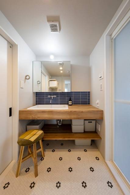 洗面は憧れの造作洗面を採用し、TOTOのSK106シンクやレトロな壁出し水栓に、お手入れのしやすいアイカのポストフォームカウンターを組み合わせて理想の洗面台を実現。