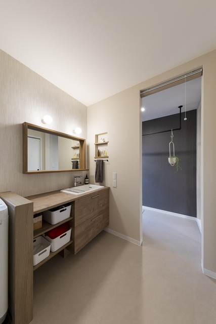 洗面台はTOTO「ドレーナ」を採用し、施主様が一目惚れされたミラーを造作で組み合わせることで特別感のある空間を演出。