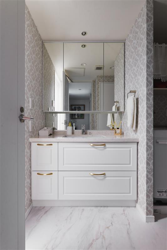 框デザインの洗面台にエレガントなアクセントクロスを合わせ、落ち着きと奥行きのある空間に。