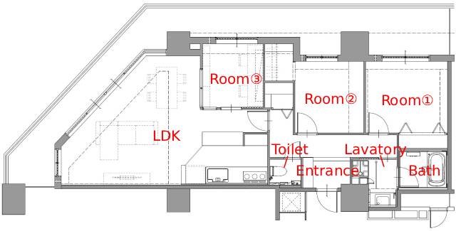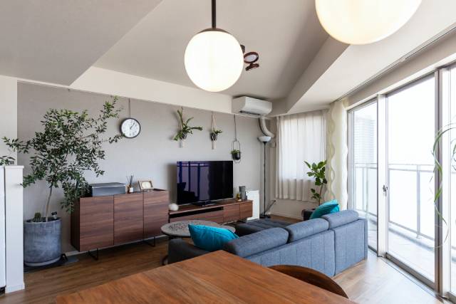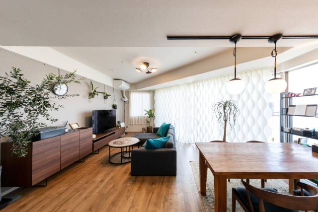 変形したLDKと折り上げ天井という特徴を活かしながら、照明とインテリアが調和する空間づくりを意識しました。